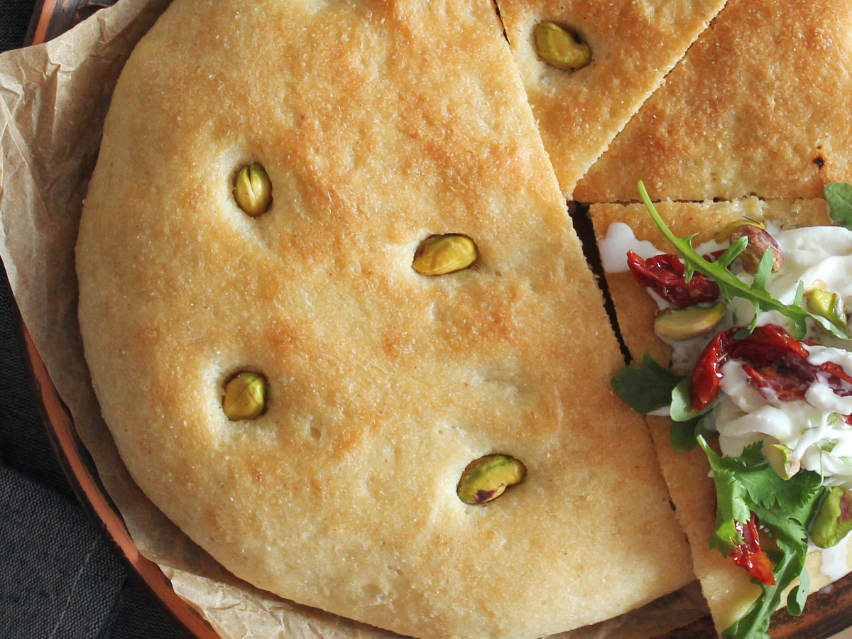 Накройте тесто и дайте ему подойти около 30–40 минут, после чего аккуратно обомните его и дайте подняться ещё раз. Затем сформируйте лепёшку, толщиной около 2 см, и сделайте углубления, в каждое из которых вставьте по фисташке.