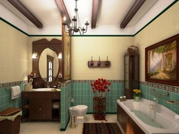 При выборе цветовой палитры для ванной в стиле кантри стоит отдавать предпочтение теплым, ярким цветам — коричневым, оранжевым и зелёным, которые создают атмосферу рождественского уюта. Эти оттенки напоминают о зрелых плодах и жарком солнце, что делает пространство поистине теплым и тёплым.