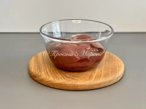 Первым делом следует подготовить печёнку. Удаляется лишняя пленка и жир, после чего печеночные кусочки тщательно обсушиваются. Затем кусочки помещаются в ёмкость, где заливаются коньяком и оставляются в холодильнике на несколько часов. Важно, чтобы коньяк был увеличенным по качеству – наличие резкого спиртового запаха может испортить весь процесс.