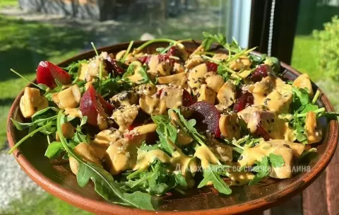При подаче на стол салат декорируется руколой, затем выкладываются ломтики маринованной свеклы и жареные шампиньоны, создавая волнующую симфонию вкусов и текстур. Также не лишним будет добавить заправку из кунжутного масла и ореховой пасты, что придаст салату завершающий штрих.