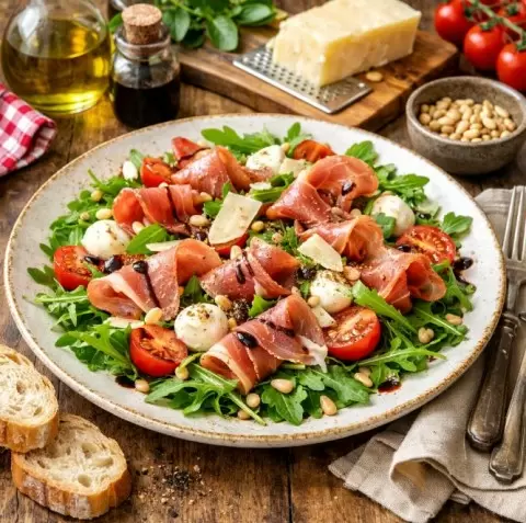 Сегодня на повестке дня восхитительный итальянский салат, который захватит ваше сердце. Нежнейшее прошутто в сочетании с перчёной рукколой, сочными помидорами и мелкими нотками сливочного сыра создают истинный гастрономический шедевр прямо из солнечной Италии.