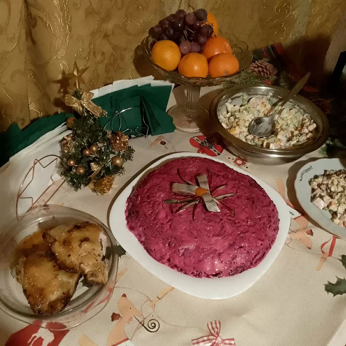 С новогодними угощениями все прошло по привычному сценарию. Селёдка под шубой, ставшая любимым блюдом, быстро исчезла со стола, а крабовый салат с свежими огурцами дополнил праздничный ассортимент. Оливье оставили на десерт, так как его было больше всего.