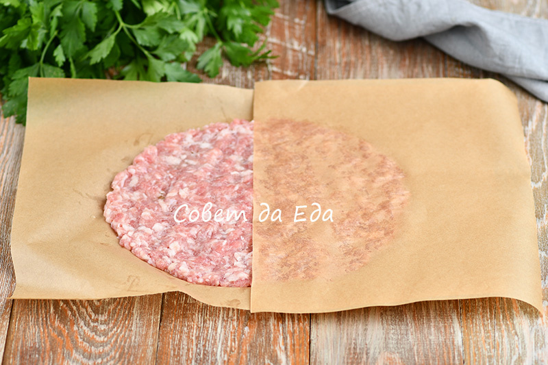 - Далее в фарш добавляются соль, перец, и формируются небольшие шарики. Эти шарики помещаются между слоями пергамента на сковороду и обжариваются на среднем огне в течение 6 минут.
